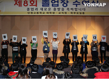 去年4月因“世越号”沉船事故而遭受创伤的檀园高中9日举行了2015年度毕业典礼。(韩联社)