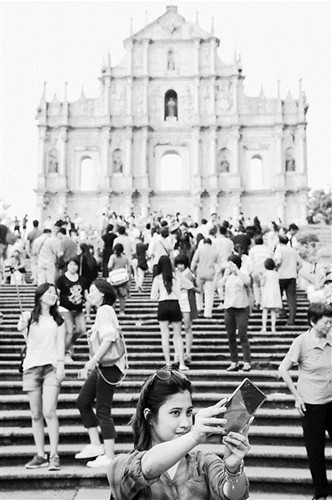 国庆长假期间,澳门大三巴牌坊、议事亭前地等旅游区人流如潮。图为游客在澳门大三巴牌坊前游览。 新华社记者 张金加摄
