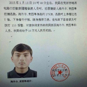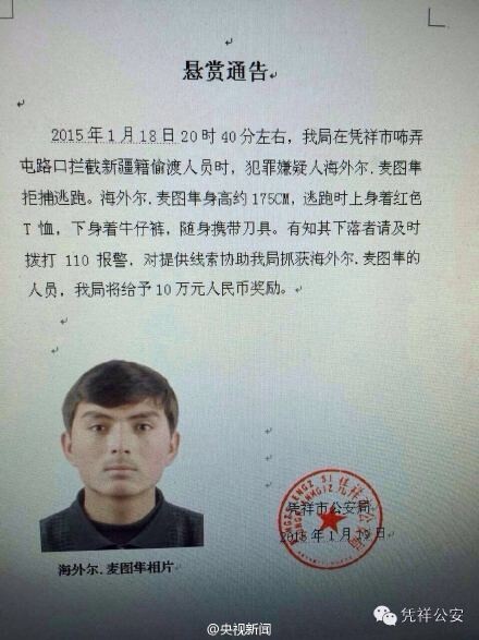 据中央电视台新闻中心官方微博“央视新闻”消息,1月18日,几名偷渡者在中越边城广西凭祥市与警方冲突,因拒捕,警方击毙其中两人,一人逃往居民区,特警武警正全城追捕。逃脱者身高1米75,上身穿红色T恤,下着牛仔裤,讲维吾尔语。警方悬赏10万元征集线索。广西警方悬赏10万元缉拿一名在逃偷渡者