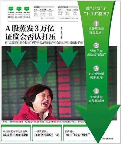 “今晚天台见!”1月19日收盘后股民们在网上呐喊。融资资金的疯狂拼抢,最终导演了“1·19”股灾悲剧。1月19日,沪指大跌7.7%创7年来最大单日跌幅,A股市值一日蒸发3万亿元。对于市场认为金融监管部门有意联合打压股市,昨日晚间,证监会回应:“这与事实不符”。“对12家存在违规行为券商采取行政监管措施,旨在保护投资者合法权益,促进融资业务规范发展,市场不宜做过度解读”。证监会新闻发言人邓舸称。【详细】