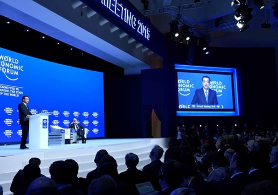 国务院总理李克强当地时间21日下午在瑞士达沃斯出席世界经济论坛2015年年会全会,并发表特别致辞。李克强强调,中国经济要实现“双中高”,必须用好政府和市场这“两只手”,开启“双引擎”——一是打造新引擎,推动大众创业、万众创新;二是要改造传统引擎,重点是扩大公共产品和公共服务供给,补齐“短板”。(1月22日新华社)
