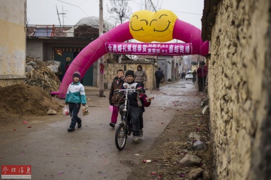 2015年1月25日,山东沂南,记者探访传闻埋着抗日名将张灵甫的遗骨的马牧池乡董家庄村刘存林家。董家庄村口,举行婚礼的拱门和孩子们。