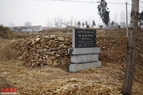 2015年1月25日,山东沂南,记者探访传闻埋着抗日名将张灵甫的遗骨的马牧池乡董家庄村刘存林家。沂南县马牧池乡董家庄村门前的石碑,标示着这里还是一处新石器时代、汉代古遗址聚落址。