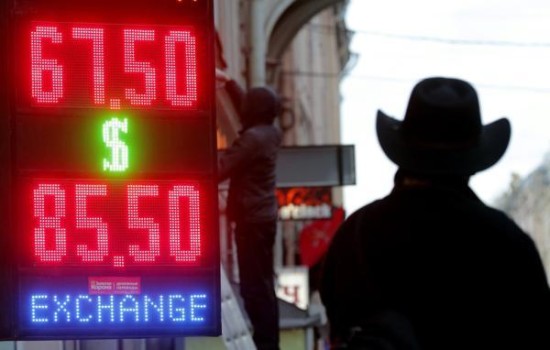 当地时间2014年12月16日,俄罗斯圣彼得堡,行人从街头显示外汇汇率行情的电子牌旁经过。 东方IC 图