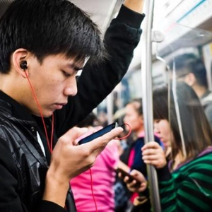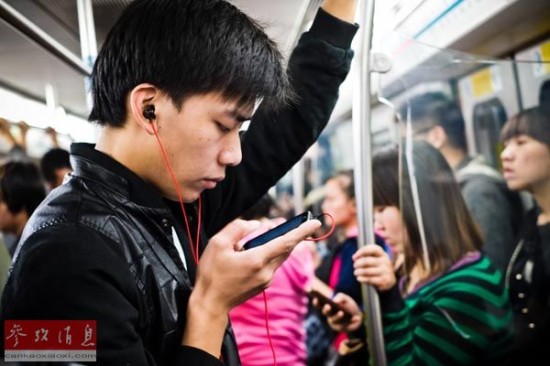 2012年10月12日,在北京地铁四号线列车上,一名年轻人在使用手机。