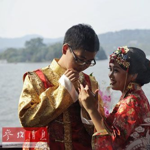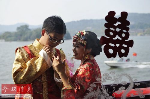 资料图:参加集体婚礼的一对新人在杭州西湖游船上。新华社记者鞠焕宗摄