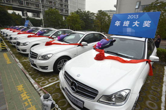 资料图片:2013年12月13日,广东省深圳市,南山区科技园一家公司排出10辆奔驰轿车作为给员工的年终奖,据网友称,该公司2012年便排出10辆高尔夫轿车做年终奖。