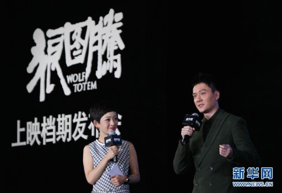 10月13日,演员冯绍峰(右)出席影片《狼图腾》在北京举行的定档新闻发布会。当日,中法合拍立体电影《狼图腾》在北京举行发布会,宣布将于2015年2月19日正月初一起在全国上映。影片根据姜戎同名小说改编,由法国导演让·雅克·阿诺执导,冯绍峰、窦骁等主演。新华社记者高静摄