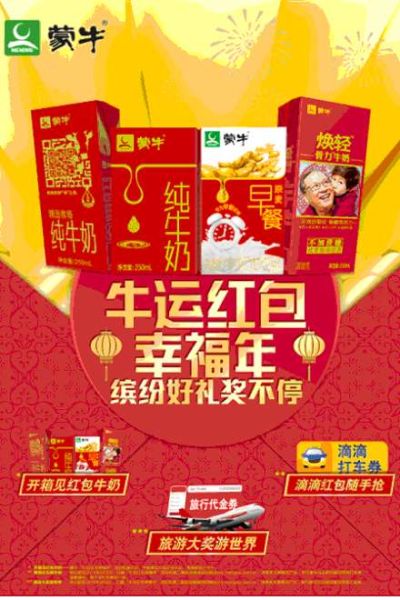 消费者只要购买蒙牛“牛运红包幸福年”包装牛奶,即可享受三重好礼:开箱见红包牛奶、滴滴红包随手抢、旅游大奖游世界,或直接登录“牛运红包幸福年”活动网站抢滴滴红包和旅游大奖,这个新春红红火火。