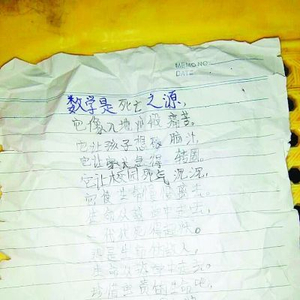 一个10岁的小女孩写了一首触目惊心的诗:数学是死亡之源,它像入地狱般痛苦。它让孩子想破脑汁,它让家长急得转圈。它让校园死气沉沉,它使生命慢慢离去。生命从数学中走去,一代代死得超快。那是生命的敌人,生命从数学中走去。珍惜宝贵的生命吧,一代代死得超快。数学是死亡之源。女孩的妈妈无奈的说没想到她竟然厌恶数学到这般田地。