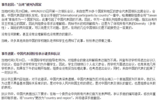领队所发文章,全文请看相关新闻《哈佛模联“台湾事件”的现场还原和思考》。