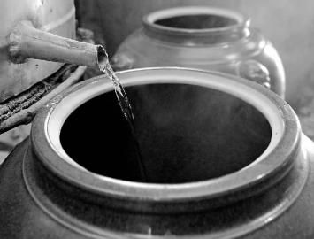 随后李静明领着我来到一个500斤装的酒坛前。“这个酒是二锅头,度数高。”(第二锅换入锡锅里的凉水冷却后流出的“锅头”酒)