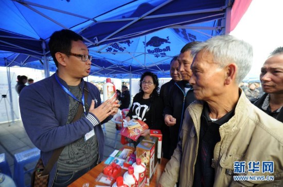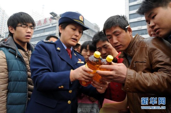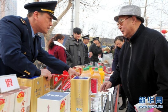 3月15日,一名工商执法人员在枣庄市城区街头活动现场向消费者介绍酒水真假的辨别方法。当日是国际消费者权益日,山东省枣庄市在城区街头举办主题宣传活动,工商、食药品、公安等部门的执法人员现场向广大消费者宣传消费维权知识和传授鉴别假冒伪劣产品知识,提供咨询和投诉服务,依法保护消费者的正当权益。新华社发(孙中喆 摄)