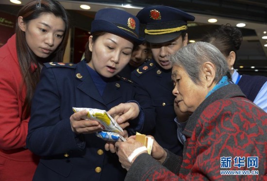 3月15日,乌鲁木齐市水磨沟区工商局工作人员向市民讲解如何辨别袋装牛奶的造假生产日期。当日是“3·15”国际消费者权益日。全国各地纷纷举行各式相关活动,向广大消费者宣传法律知识和鉴别假冒伪劣产品知识,提供咨询和投诉服务,依法保护消费者的正当权益。新华社记者 王菲 摄