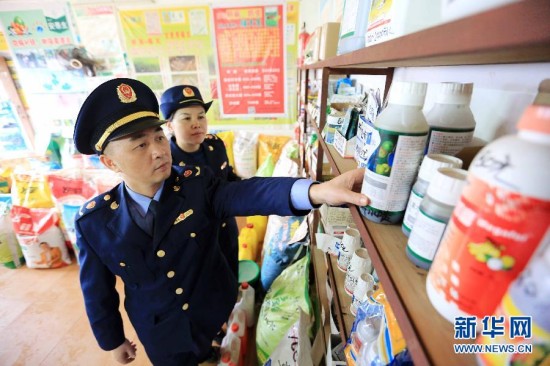3月14日,广西融安县大将工商所执法人员在一家农资商店检查农药标识。眼下正值春耕备耕时期,广西融安县工商局开展“红盾护农”专项行动,对辖区农资经营站点进行拉网式检查,严厉打击销售假冒伪劣农资产品的违法行为,确保农民用上放心的春耕农资,为农民春耕生产“保驾护航”。新华社发(谭凯兴 摄)