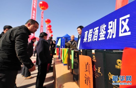 3月15日,在呼和浩特苏亚拉公园广场,市民现场学习鉴别酒水真假。当日是“3·15”国际消费者权益日。全国各地纷纷举行各式相关活动,向广大消费者宣传法律知识和鉴别假冒伪劣产品知识,提供咨询和投诉服务,依法保护消费者的正当权益。新华社发(连振 摄)