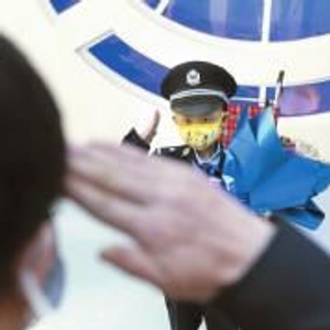 这是刘梓曦第一次见到“真正”的小警服。不过,他并没有欢呼雀跃或者喊叫出什么高兴的话,他只是瞪着大眼睛,安静地打量眼前的戴着口罩的女警和她手中的警服。他的眼神有一些激动,也有一些茫然,表情有些严肃。