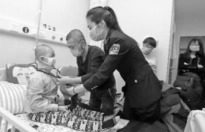 胡爱军:就想当警察?想维护社会安宁,维护世界正义,主持公道对不对?知道当一个真正的警察,你需要满足什么样的条件吗?你现在已经是个荣誉警察了,想成为一个真正的警察,必须要好好学习,必须要有好的身体。你要勇敢,要坚强,知道吗?警察都是不怕疼的,你打针的时候,一定要配合医生和护士,配合治疗。你怕疼吗?