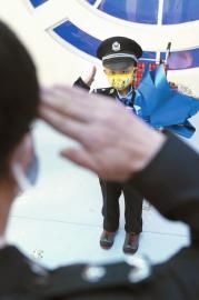 整理好警容风纪,付长坤向刘梓曦献上一束鲜花,然后敬礼。刘梓曦一手捧着鲜花,一手同时做出敬礼姿势。