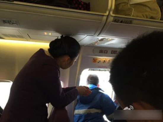 资料图片:男子在飞机起飞前打开安全门 头伸门外称要透气