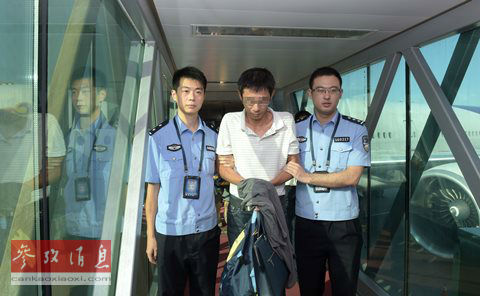 “猎狐2014”赴泰国集中缉捕成果丰硕。9月27日,中国警方在泰国执法部门大力配合下抓获的四名重大经济犯罪嫌疑人赵某、庞某、龙某、张某, 从泰国曼谷被顺利押解回北京。图为当日,在北京首都国际机场,犯罪嫌疑人张某被押解回国。图片来源:新华社