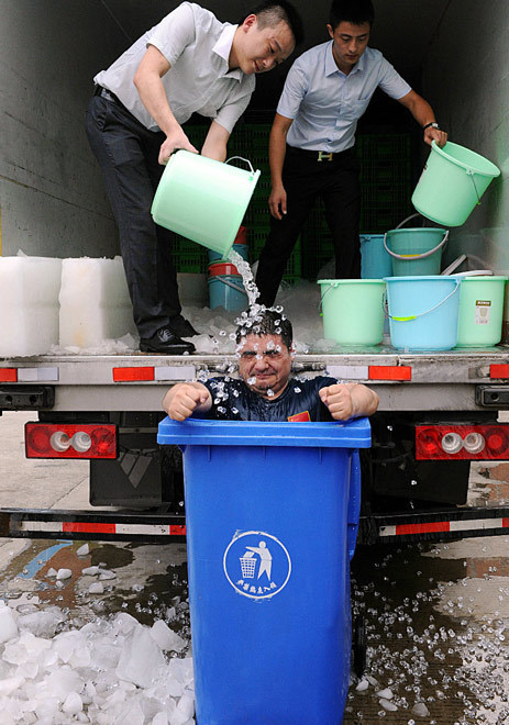 2014年8月22日,陈光标发微博称“陈光标坐垃圾桶挑战冰桶记录”,画面中,陈光标坐在充满冰水的垃圾桶内被泼冰水,并上演“胸口碎大冰”以示决心。图片来源:新浪微博