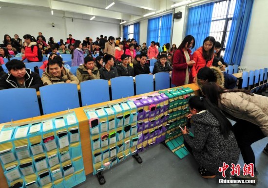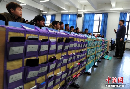 12月10日,河北师范大学信息技术学院课堂上,中央第一排桌椅空无一人,却专为学生手机私人订制了“座位”,学生们进入教室后,将手机对名入袋。据学校介绍,为解决“课堂低头族”现象,防止学生上课总玩手机,影响听课效果,实行“手机收纳、人机分离”的方案。学院为每个班配备手机收纳袋,袋上标明学生姓名和学号,上课前,将手机关闭或静音放入袋内,下课后自行取走。图为下课时,学生们分批逐个将手机取走。中新社发 翟羽佳 摄