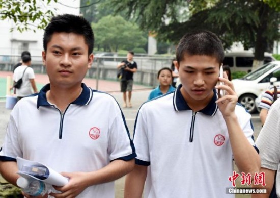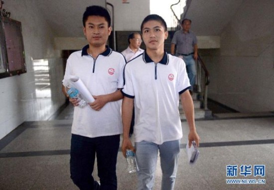 7月3日,柳艳兵(右)和易政勇结束考试,走出考场。