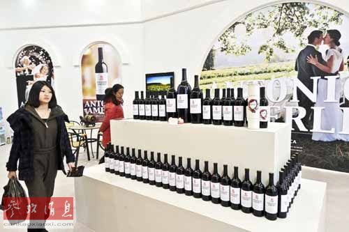 资料图片:2013年3月1日,市民在北京婚博会上参观展出的婚礼用红酒。新华社发(王京生 摄)