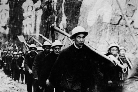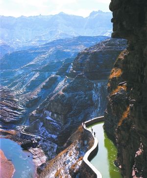 上世纪60年代,林县(今河南省安阳市林州)人民靠一锤、一钎、一双手,苦干10个年头,硬是在万仞壁立、千峰如削的太行山上,斩断1250个山头,架设152座渡槽,凿通211个隧洞,建成了全长1500公里的“人工天河”——红旗渠。