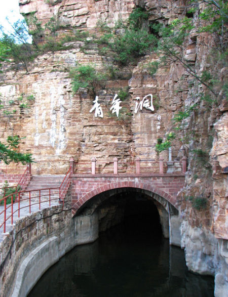 青年洞是红旗渠上的咽喉工程,也是总干渠上最大的隧洞之一。长616米,宽6.3米。1960年2月,当总干渠修到狼牙山“小鬼脸”上时,正遇一边高山挡道,一边悬崖峭壁,崖下深处是漳河,除了开山凿洞,别无办法。红旗渠工程指挥部当即决定,组织一支青年突击队来征服这个天险。300多青年,经过17个月的英勇奋战,终于凿通了这个岩石隧洞。