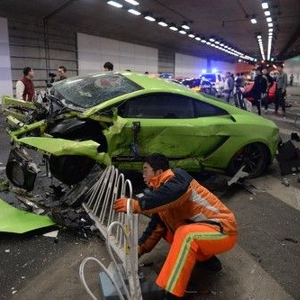 今日中午2时,北京市公安局公安交通管理局官方微博“北京交警”通报:2015年4月11日晚,在北京市朝阳区大屯路隧道内,于某(男,20岁,吉林省长春市人,无业)驾驶红色法拉利牌小客车、唐某(男,21岁,北京市人,无业)驾驶绿色兰博基尼牌小客车由东向西行驶过程中发生交通事故,车辆与隧道墙壁和道路护栏发生碰撞,两车严重损坏。
