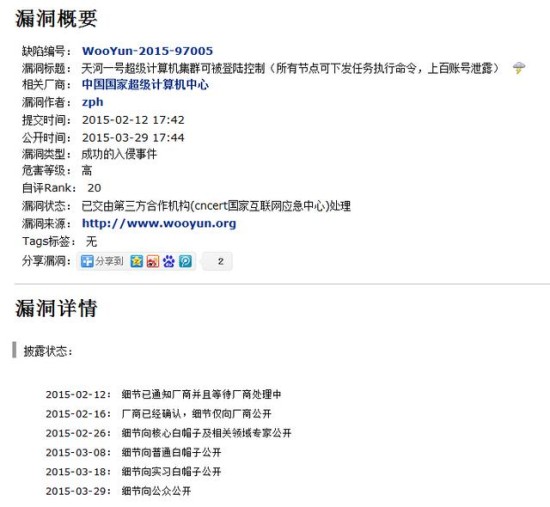 腾讯科技讯 3月30日消息,漏洞报告平台乌云昨日公开发布最新高危漏洞显示,天河一号超级计算机集群可被登陆控制,这造成所有节点可下发任务执行命令,上百账号或泄露。