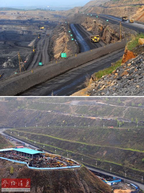 资料图片:面对生态困境,山西不断加快转型发展步伐,加大环境治理保护力度,这些年来山西由“黑”变“绿”,逐渐愈合生态伤痕的过程。上图为2012年7月山西省朔州市平朔煤矿矿区;下图为2014年9月山西省朔州市平朔煤矿正在进行绿化复垦的矿区。