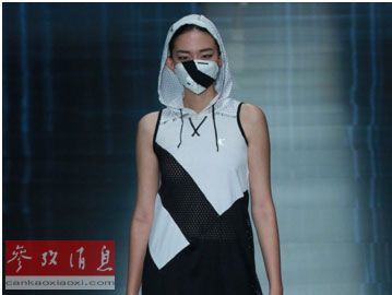 在上个月的中国国际时装周上,中国设计师尹鹏在乔丹运动装发布会上用各种口罩充当服装配饰,同系列的运动装与口罩有相同的条纹和图案。尹鹏甚至尝试了类似于全面罩的概念运动装设计。