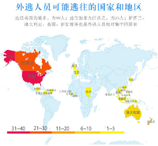 名单里的大部分在逃人员可能逃往的国家和地区都与中国没有引渡条约。其中有40人可能在美国,26人可能在加拿大,有5人被认为在香港。香港与内地之间没有引渡条约。