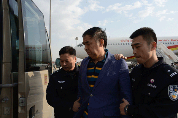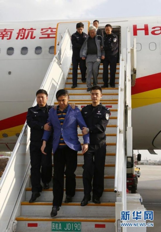 3月28日,天津市国税局直属分局原局长庞顺喜(前中)、天津港保税区瀚通国际贸易有限公司原总经理安慧民被押解回国。新华社记者 殷刚 摄