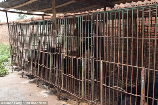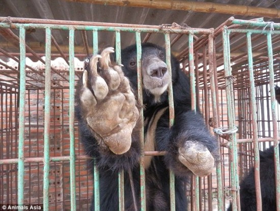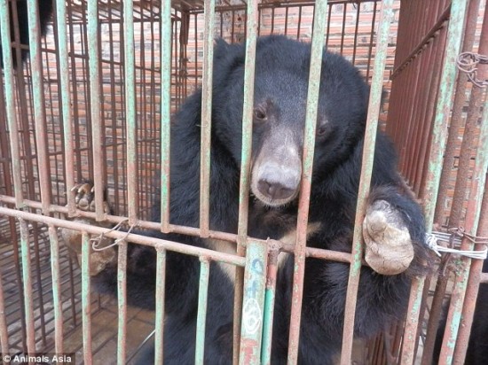 2015年4月9日报道,有记者暗访到在越南的一个屠宰场正在大肆屠杀月熊赚钱(此熊体侧向后有一淡黄色半环状宽带纹,状似“月牙”,故有“月熊”之称)。在这里,平均两天会有一只熊被杀死。他们从月熊那抽取熊胆汁,并且切除他们的熊掌卖钱。图为一只被切去一只熊掌的熊从笼子中伸出手来。