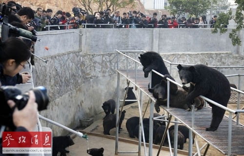 2月22日,大批记者在福建归真堂药业活熊基地内拍摄养殖的黑熊。(资料图片)