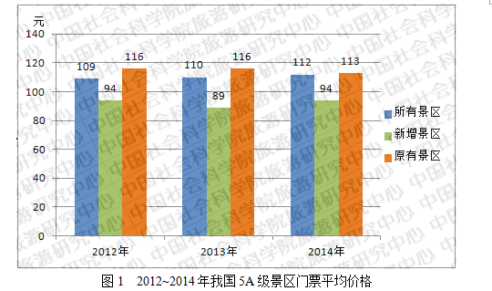 统计各年度所有5A景区门票平均价格发现,2012~2014年分别为109元、110元和112元,基本保持稳定。所有5A景区、新增5A景区、原有5A景区的平均价格见图1。
