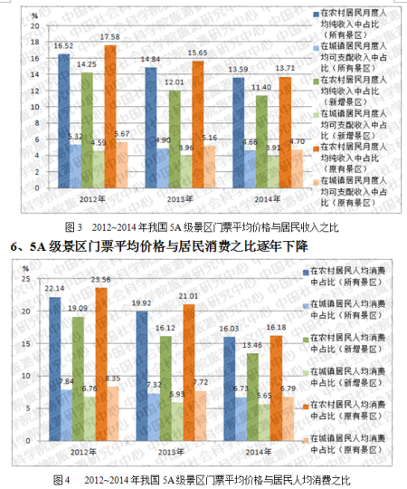 将全国所有5A级景区门票平均价格与居民消费数据进行比较后可见:2012~2014年我国5A级景区门票平均价格分别相当于当年农村居民月度人均消费的22.14%、19.92%和16.03%,相当于当年城镇居民月度人均消费的7.84%、7.32%和6.73%(见图4)。