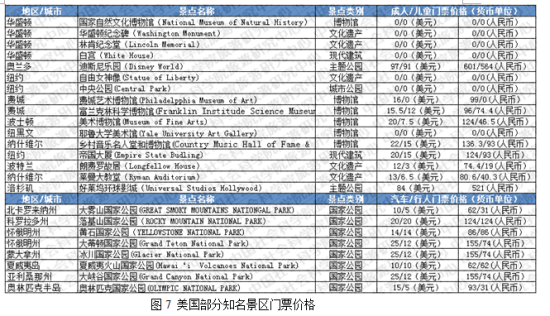 由于经济发展条件、景区管理体制等方面的差异,世界各国景区门票定价原则及具体价格不尽相同,即使同一个国家,往往也因景区具体情况不同而有所差异,因此直接比较有一定局限性。不过搜集欧洲、美国、日本、韩国部分知名景区的门票价格后发现,除迪士尼、环球影城等主题公园外,其他知名景区(包括文化遗产、国家公园、博物馆等)门票价格均不高,大多低于中国同等类型的景区,相当一部分还实行免票政策。这也是值得关注的事实。