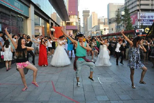 在沈阳一家商场举行的活动中,人们跳起了《小苹果》的舞蹈。图片来源于网络