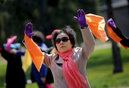 据路透社网站5月4日报道,一年到头,每天晚上五棵松万事达中心外的一个大广场上都会聚集众多老太太,跟着领舞一起跳舞。领舞带着她们完成各种舞蹈动作,以帮助她们保持健康,在寒冷的冬天里则帮助保暖。