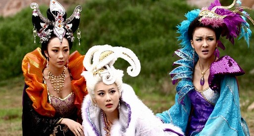 《武媚娘》因含大量爆乳镜头,因此播出后屡遭禁播,左起为范冰冰、张钧甯、周海媚。(图片来源于网络)