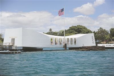 怀着肃穆的心情,当地时间5月3日上午11点15分,记者来到珍珠港。亚利桑那号战舰纪念馆门票免费,包括观看一段珍珠港空袭纪录片和往返亚利桑那号战舰纪念馆的船票。纪录片再现了残酷的战争,飞机的疯狂轰炸,像火山爆发一样的舰船以及四下逃亡的士兵。观影游客中,有不少是来自日本的,情景再现让他们表情十分凝重。20多分钟的纪录片结束后,众人被船送往位于海上的纪念馆。记者注意到,整座纪念馆通体白色,两头翘起中间低,呈马鞍状,横跨在亚利桑那号战舰水下舰体上方,与沉没的战舰组成一个巨大的十字架。纪念馆主厅两侧各开7个窗口,象征战舰沉没的日期。穿过主厅走进中心位置,1177名亡者的名字刻在白色大理石壁之上。而在石壁两侧,墙体被建成生命树的形状,寓意着和平。
