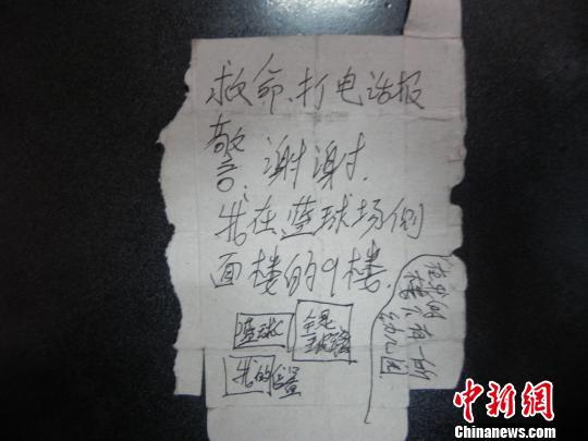 据警方称,4月27日下午,韶关曲江环卫工人张姨在马坝河边的群井巷清扫卫生,忽然发现一个扑克牌盒从天而降,张姨捡起扑克牌盒,发现里面塞有10元钱,打开一看,扑克牌盒里内写有求救信息:“救命,打电话报警,谢谢,我在篮球场侧面楼的9楼。”张姨随即向正在路面巡逻的马坝派出所民警报警。