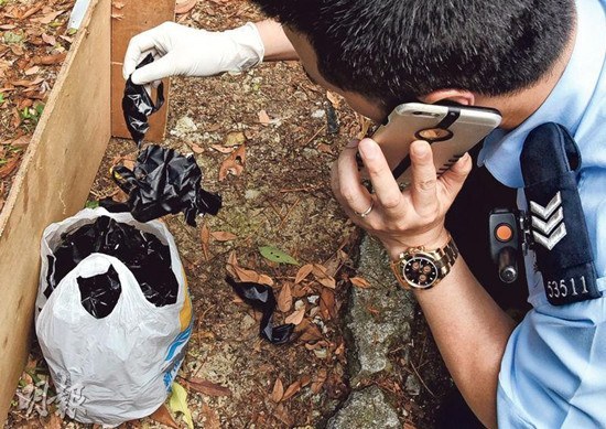 资料图片:警员检查百花林路小径旁一个胶袋,内有黑色胶纸、一包香烟及一件深色衣服,不排除是绑匪遗下。图自香港《明报》