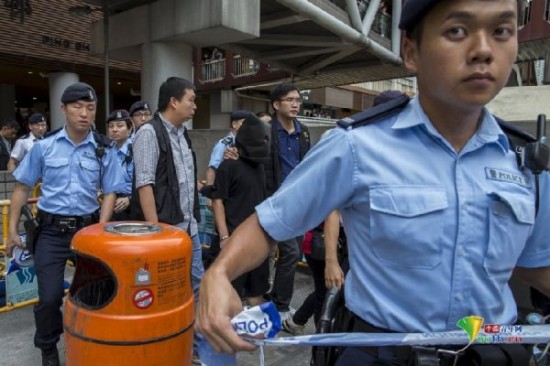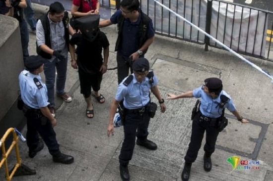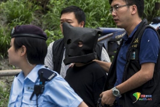 2015年5月5日,香港,警察在一名被疑参与西贡2800万绑架案的嫌犯(戴着头罩)附近行程隔离警戒带。轰动香港的西贡2800万绑架案,除了4日在罗湖口岸落网的主犯郑兴旺(29岁)外,其余5名绑匪全部在深港落网,但赎金尚未寻回。