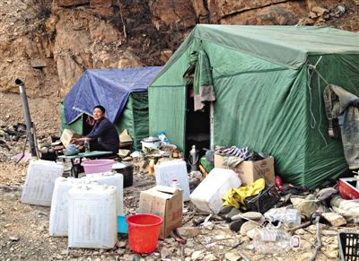3月26日,平谷金海湖镇将军关村,金山一矿洞口,采金工人们搭起帐篷,宿营。